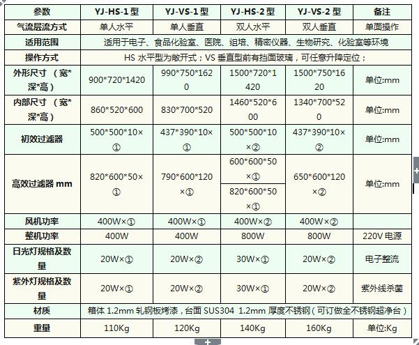 常規(guī)超凈工作臺技術(shù)參數(shù)一覽表